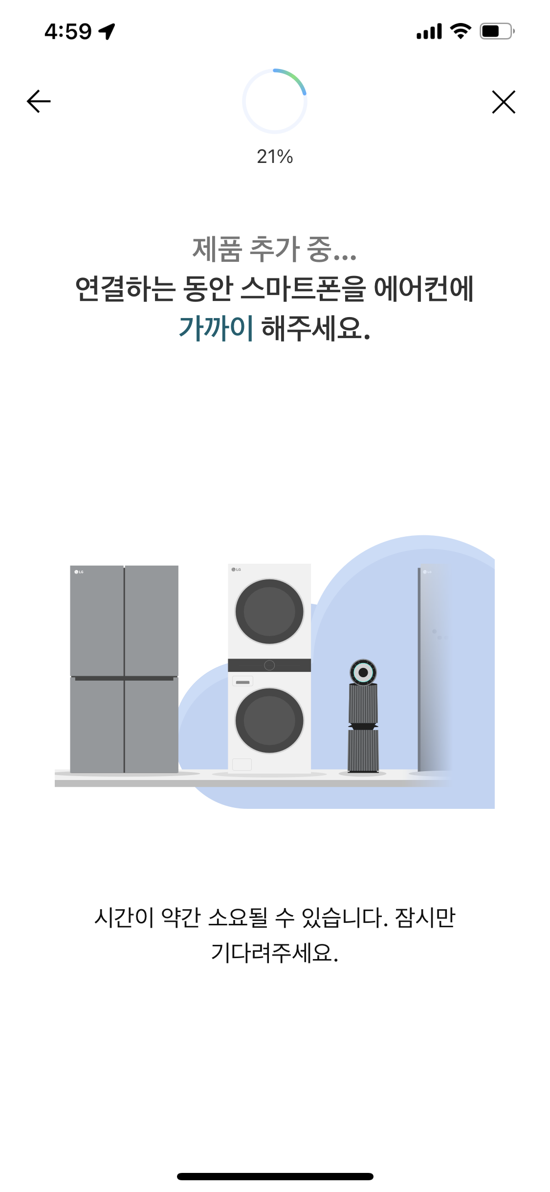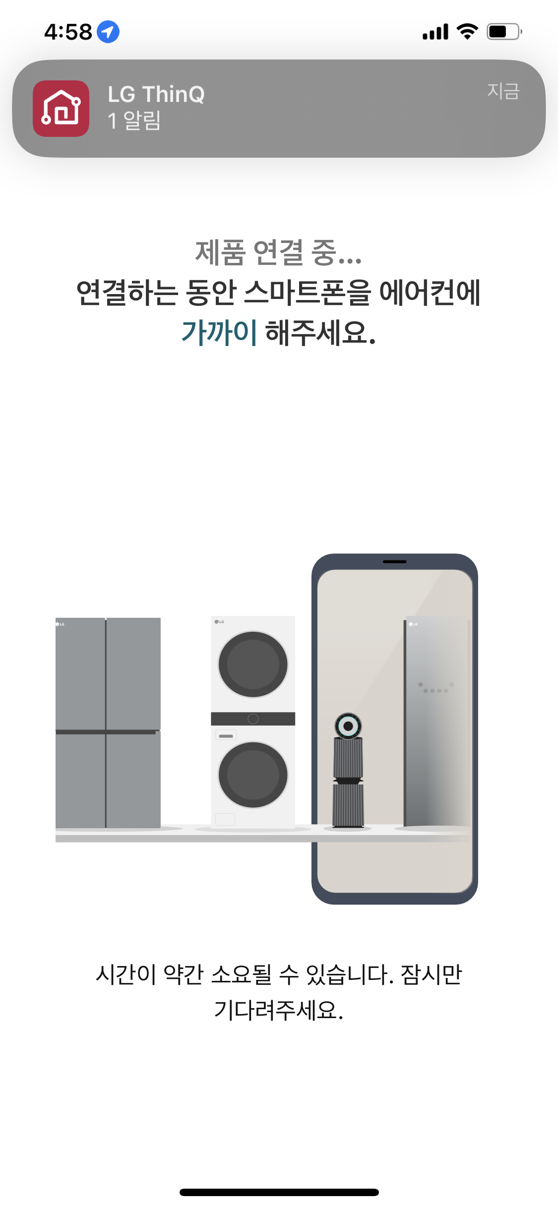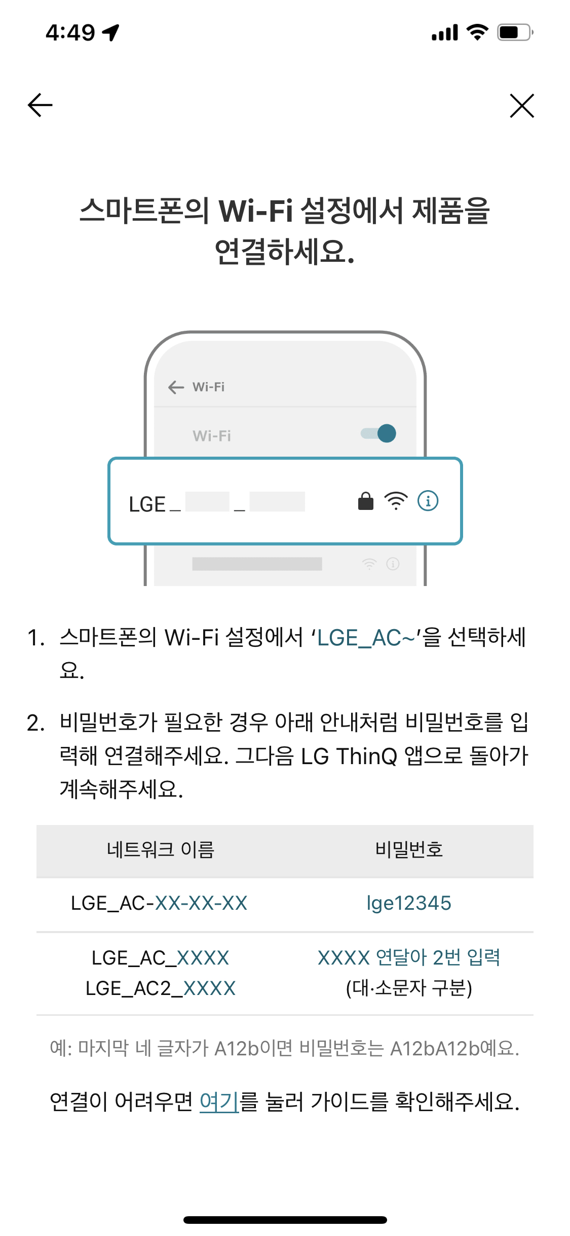 이때 LG_AC_XXXX 또는 LG_AC2_XXXX 형식으로 잡히는 네트워크를 선택해 주셔야 합니다.