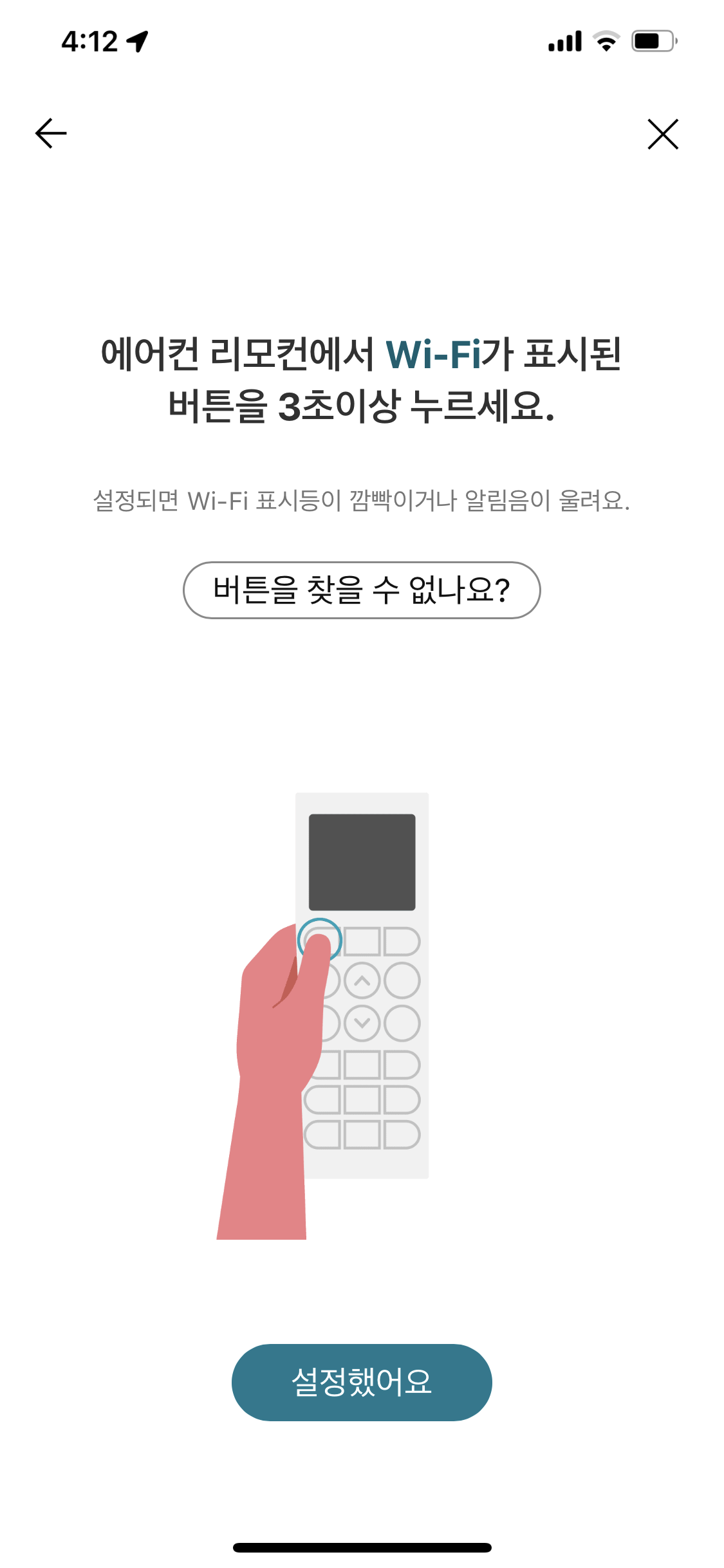 이제 스마트폰의 WiFi 연결을 에어컨에서 보내고 있는 WiFi네트워크로 연결해 주세요.