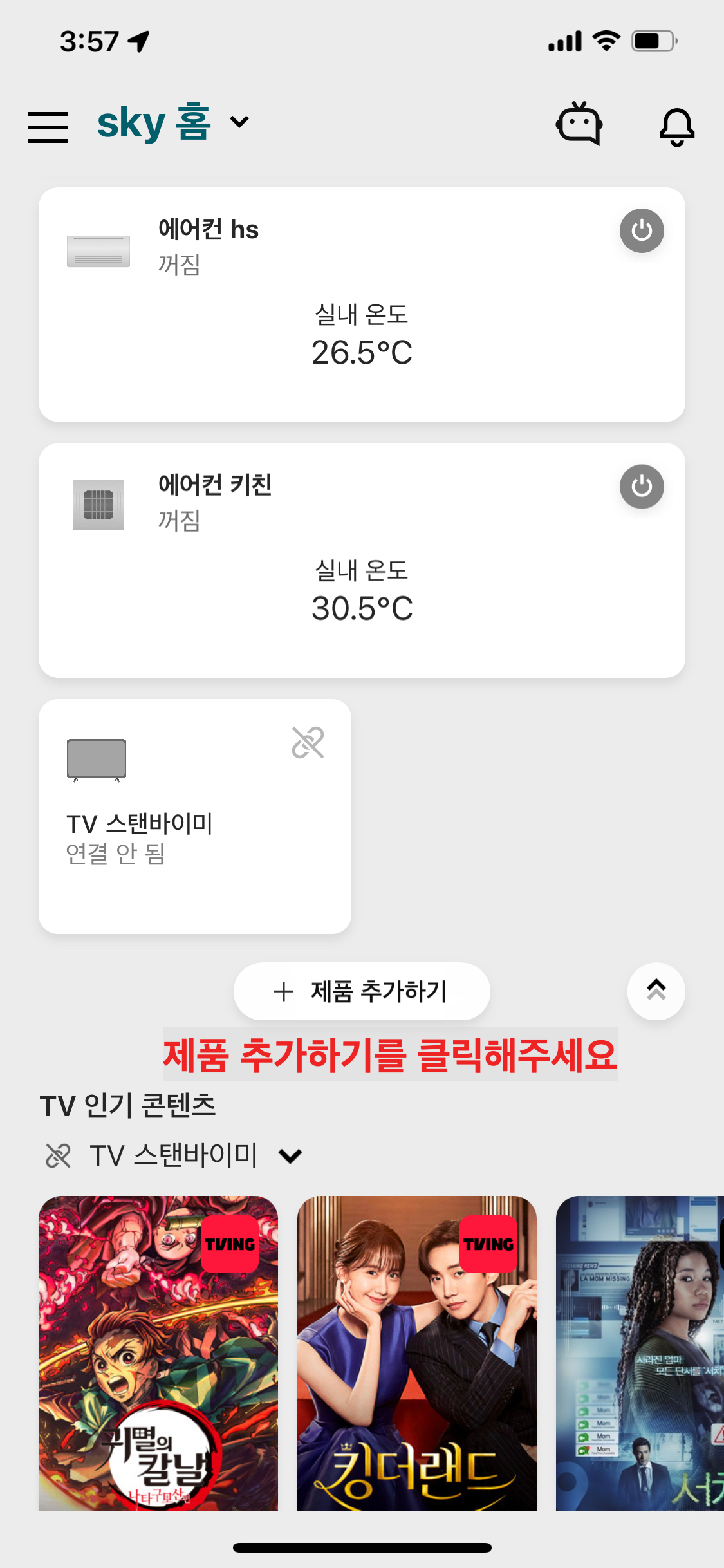 에어컨을 연결하려면 맨 아래에 있는 '제품 추가하기' 버튼을 클릭해 주세요.